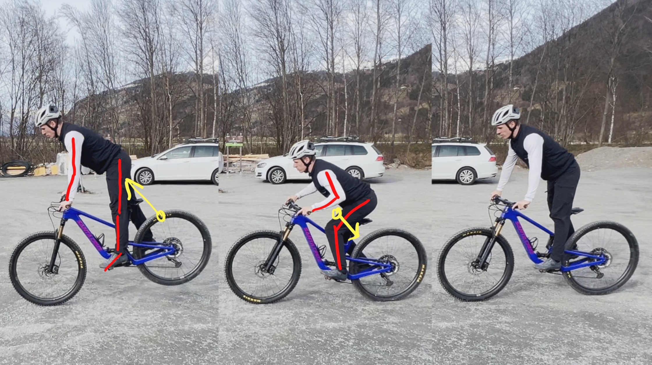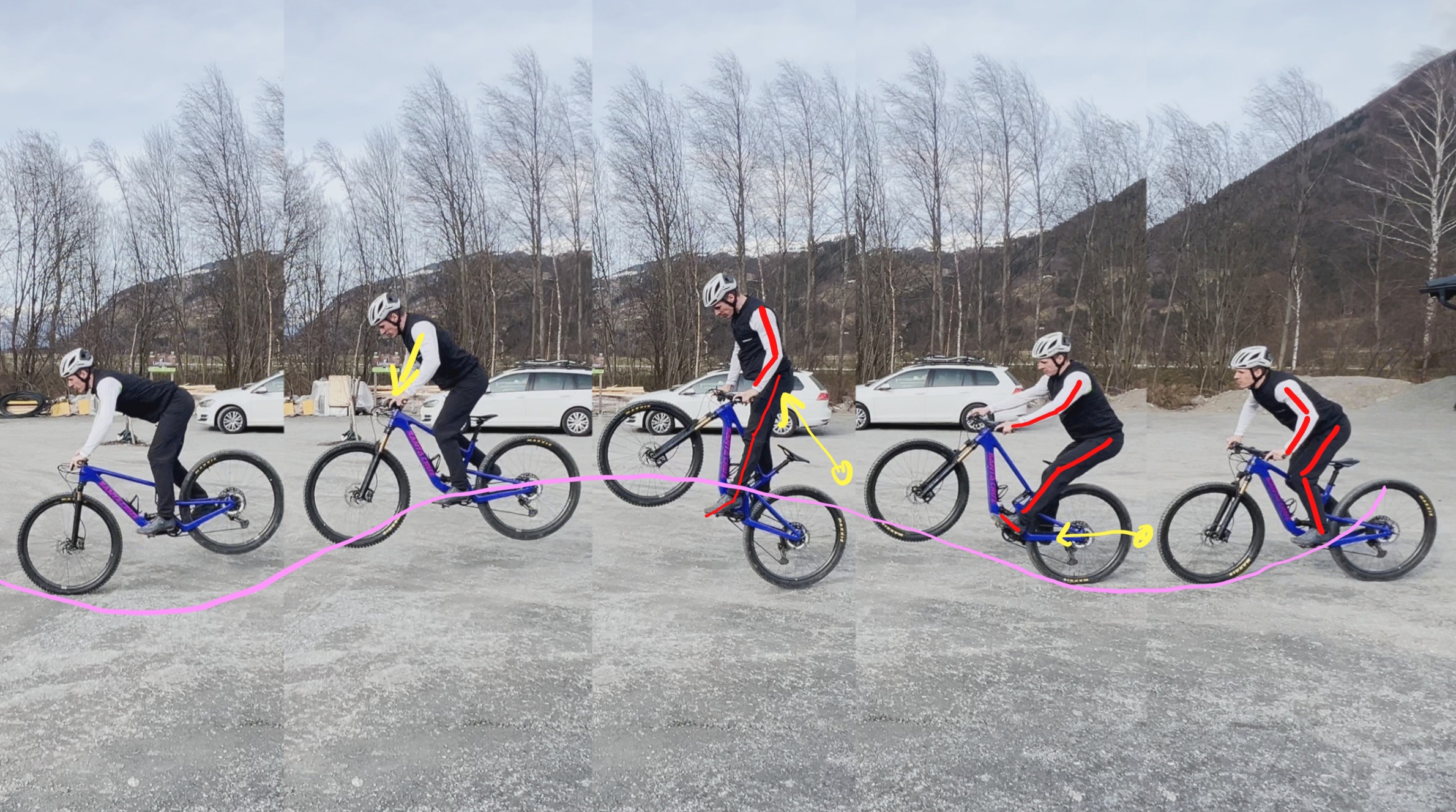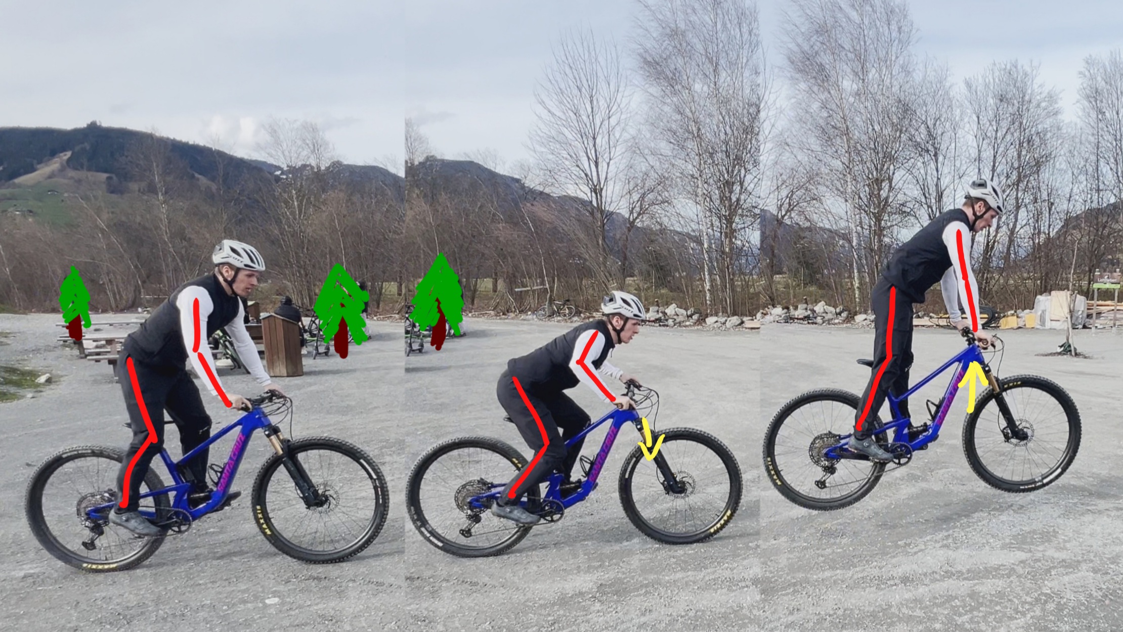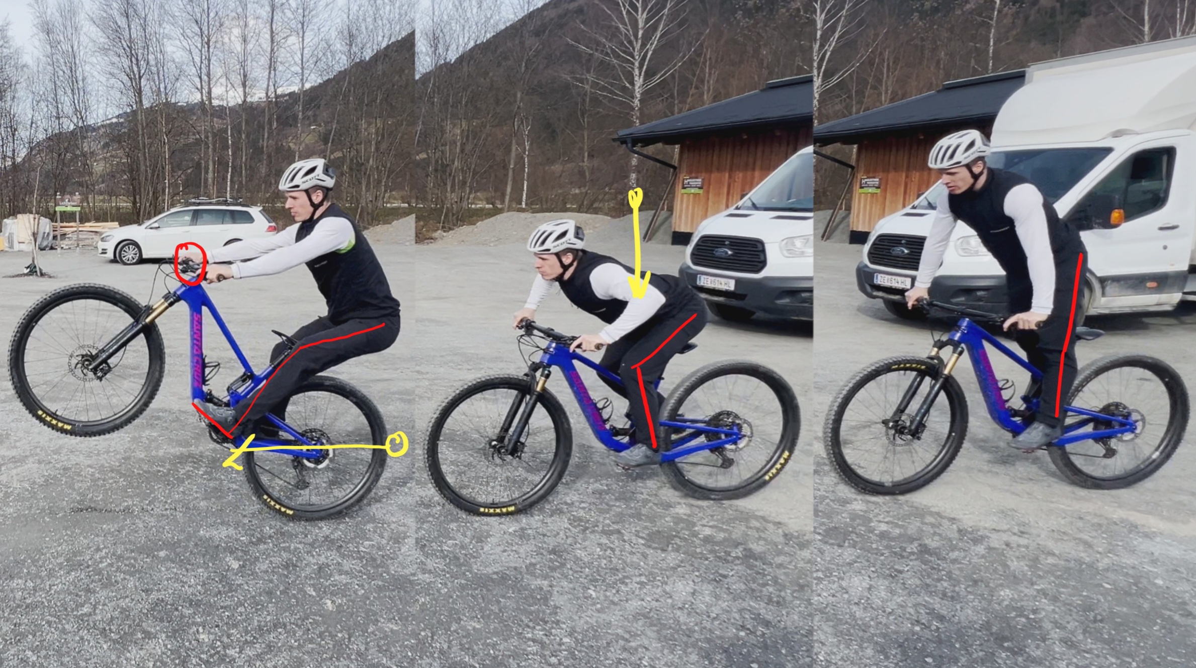 KSP leicht nach hinten (Arme und Beine fast gestreckt) → Kein Abheben des Hinterrades