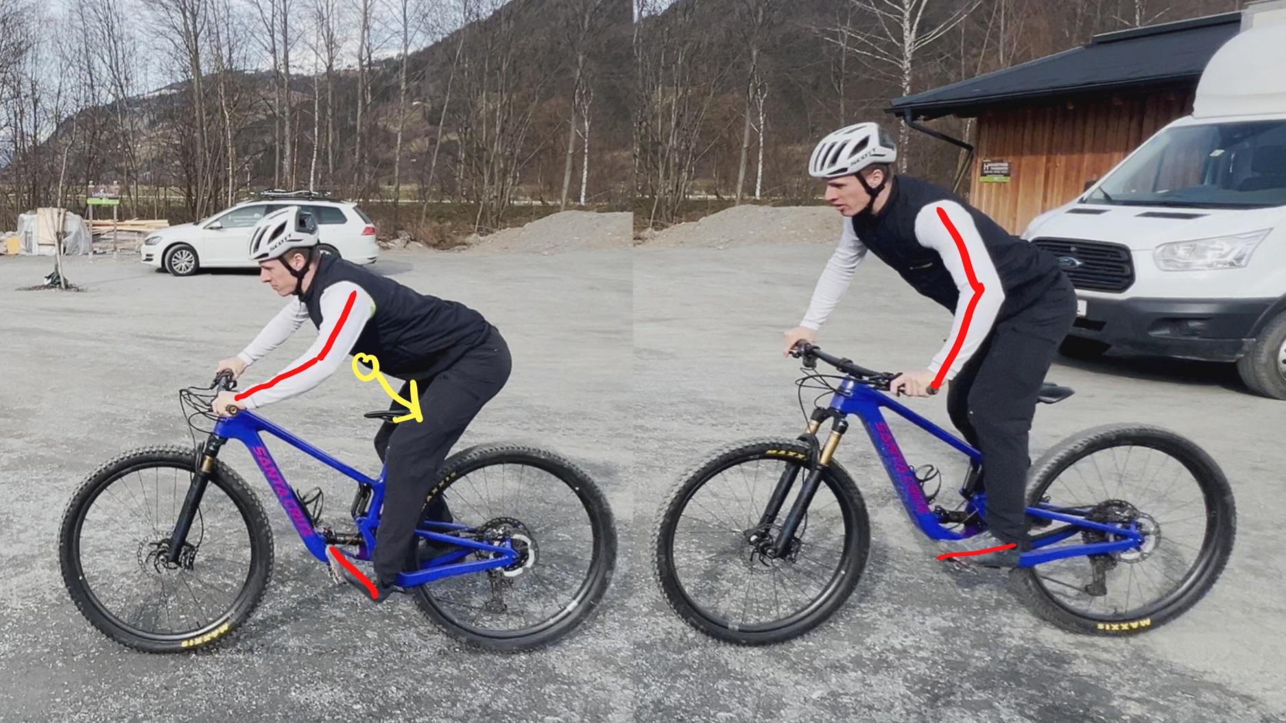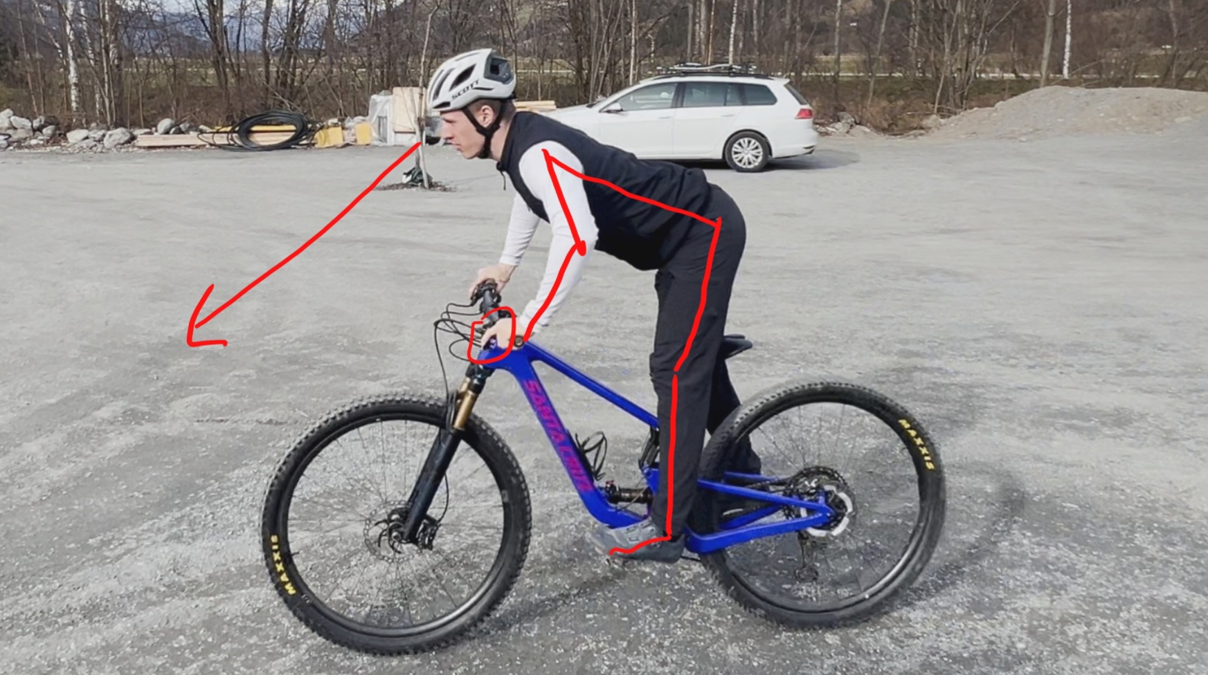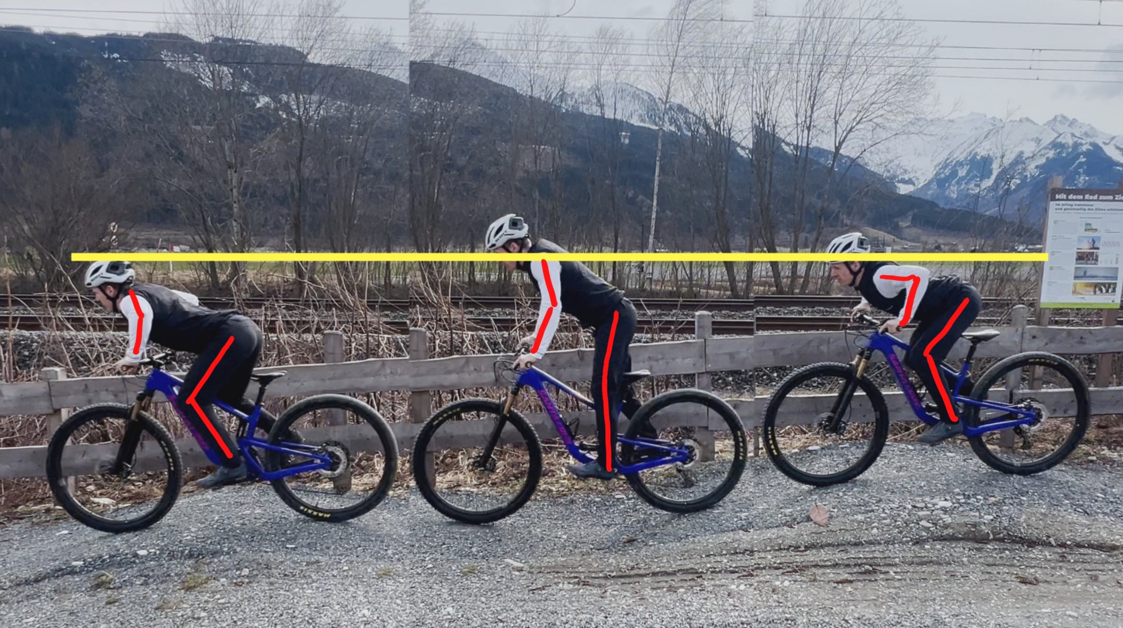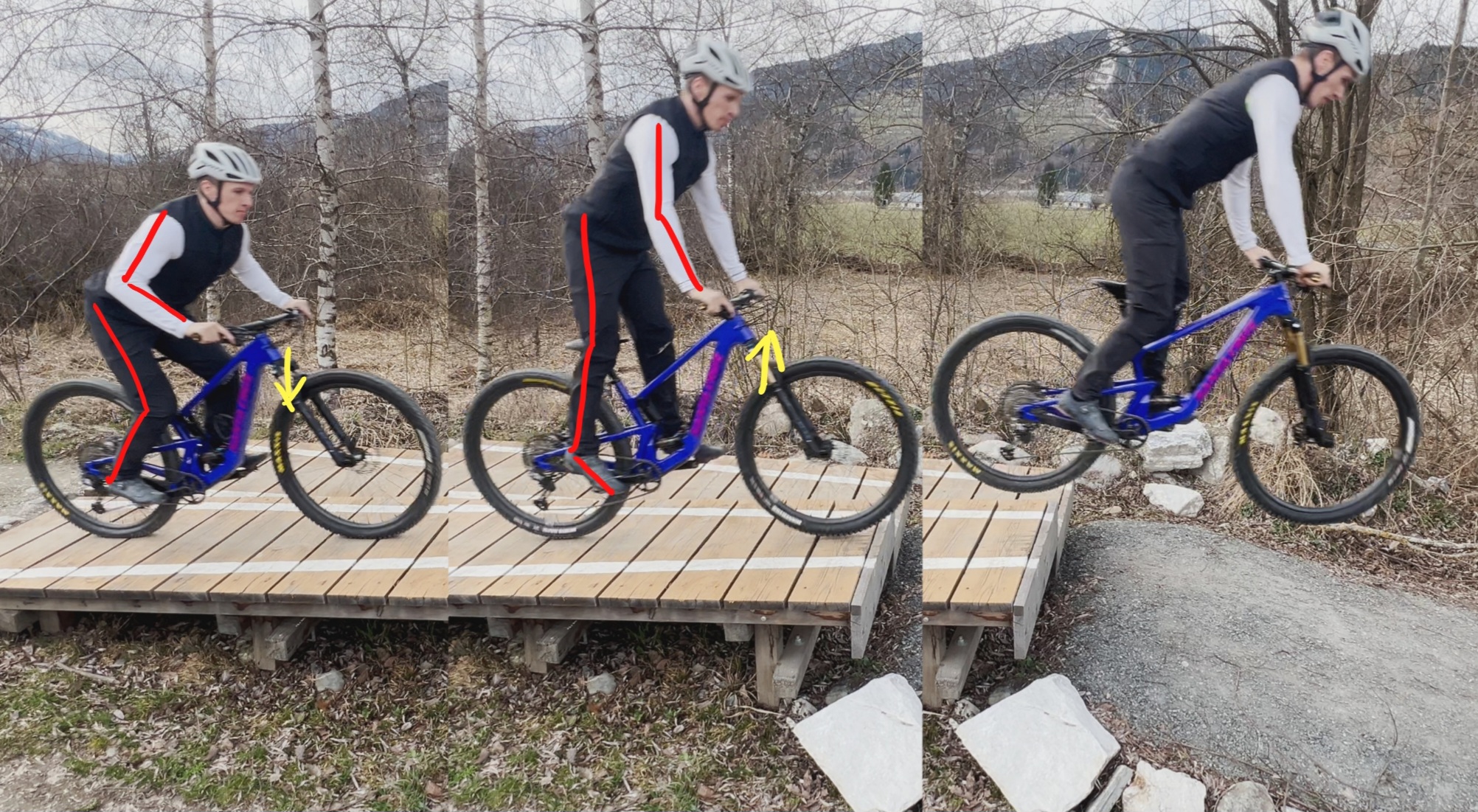 KSP leicht nach hinten (Arme und Beine fast gestreckt) → Kein Abheben des Hinterrades